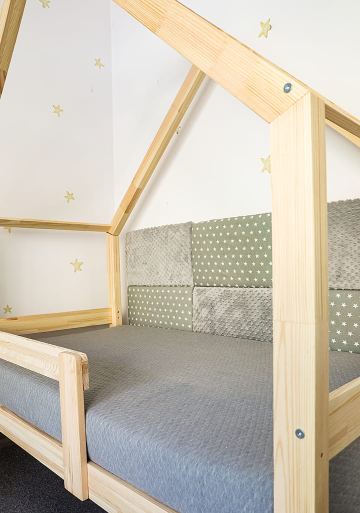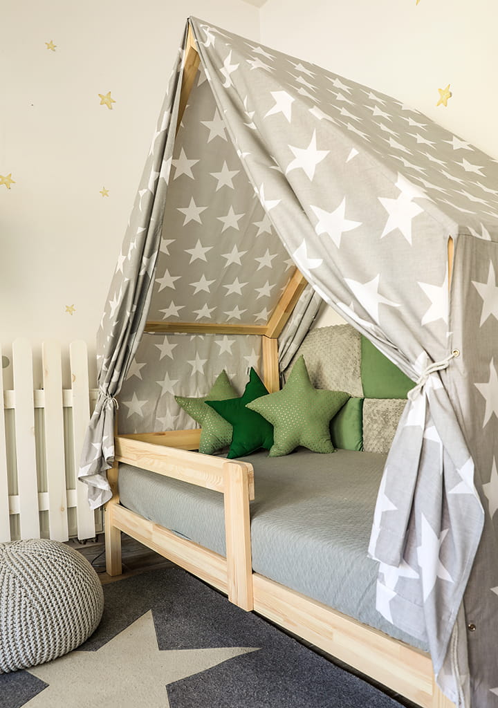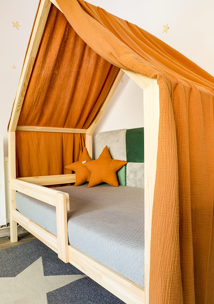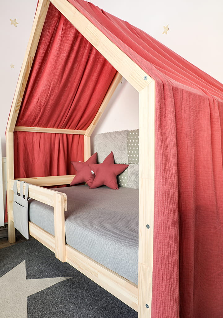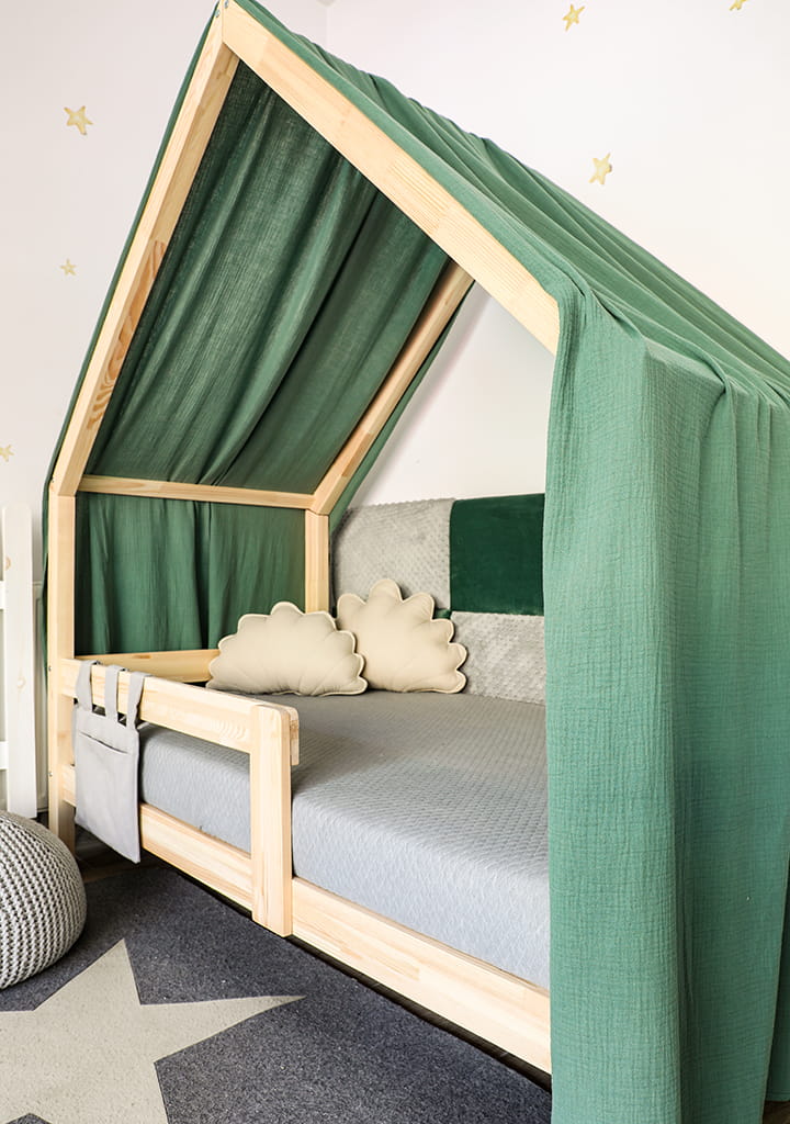 Montessori Hausbett ist ein perfekter Ort zur Erholung und zum Spielen für jedes Kind. Am Tage dient das Haus zum Spielen, in der Nacht kann man drin gut schlafen.