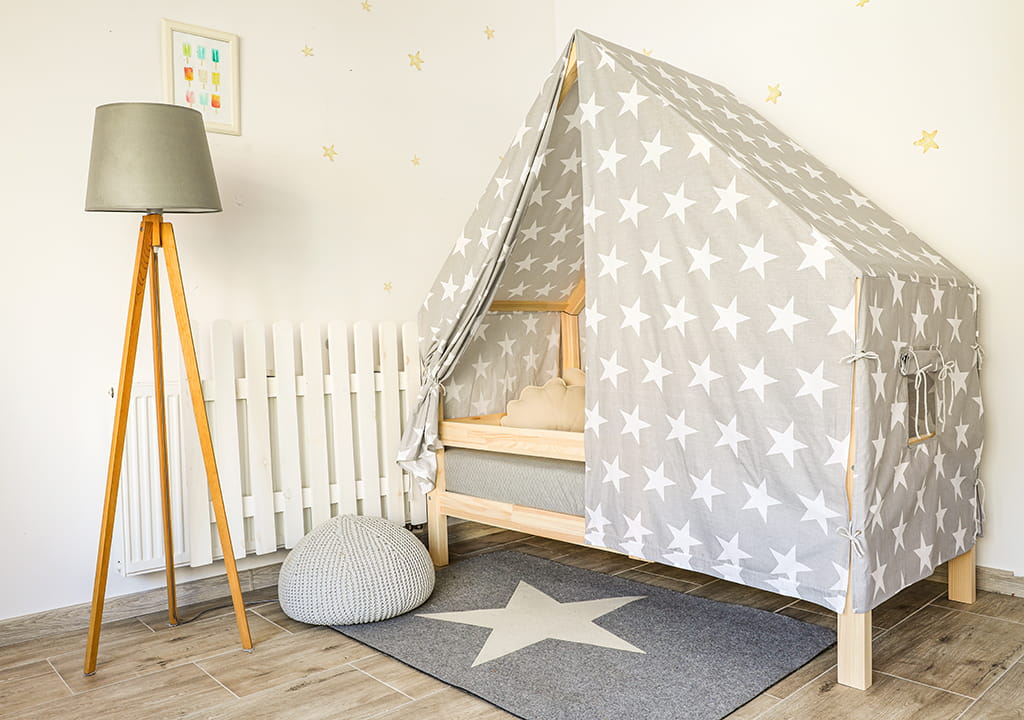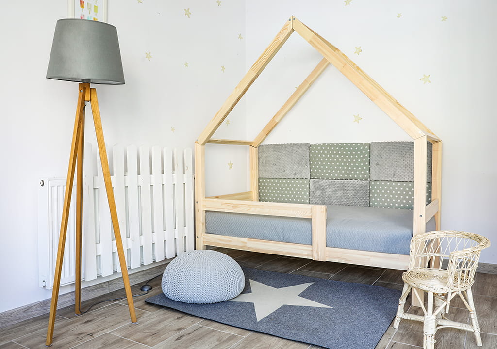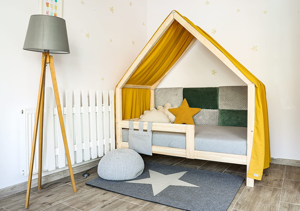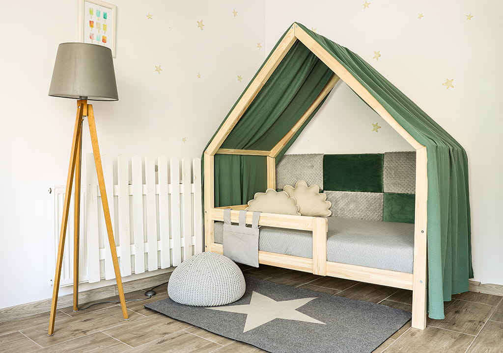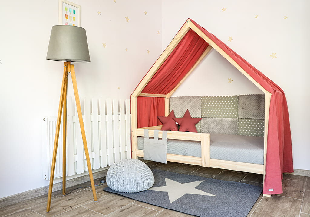 Montessori Hausbett ist ein perfekter Ort zur Erholung und zum Spielen für jedes Kind. Am Tage dient das Haus zum Spielen, in der Nacht kann man drin gut schlafen.