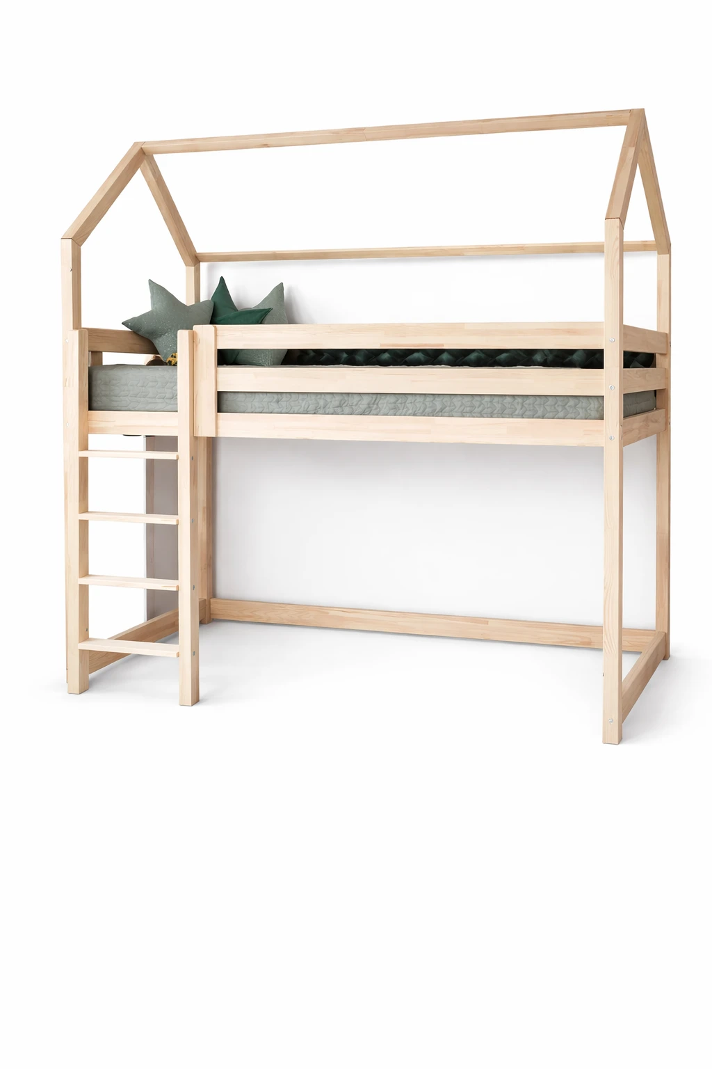 Unsere Betten werden aus geklebter Kiefer Klasse I hergestellt. Verkauft werden sie unbemalt. Für die Kinder ist nämlich natürliches, sehr glattes Holz am sichersten.