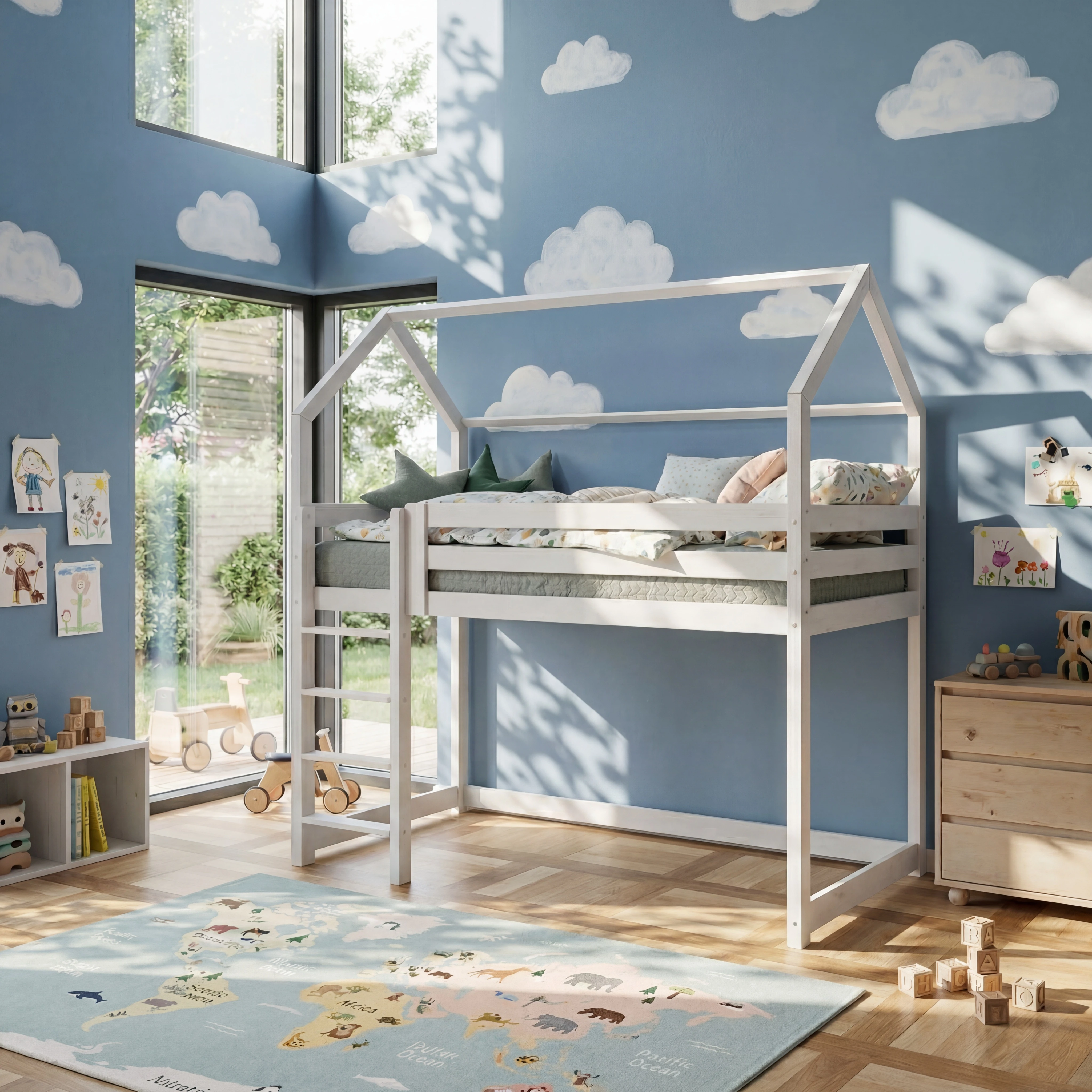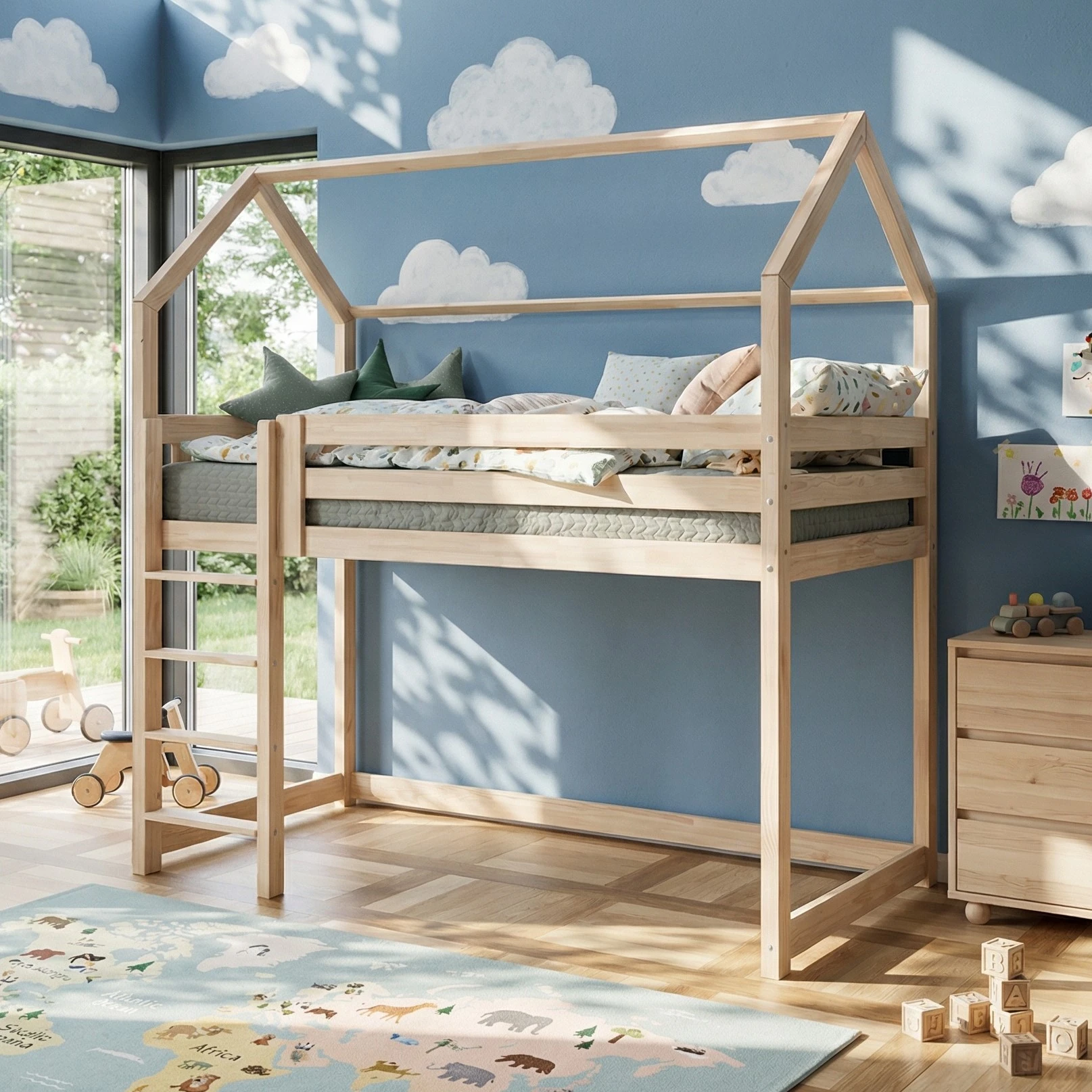 Bett – Holzhaus ist ein perfekter Ort zur Erholung und zum Spielen für jedes Kind. Am Tage dient das Haus zum Spielen, in der Nacht kann man drin gut schlafen.