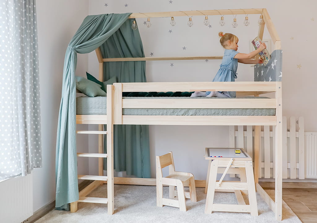 Unsere Betten werden aus geklebter Kiefer Klasse I hergestellt. Verkauft werden sie unbemalt. Für die Kinder ist nämlich natürliches, sehr glattes Holz am sichersten.