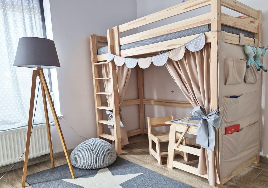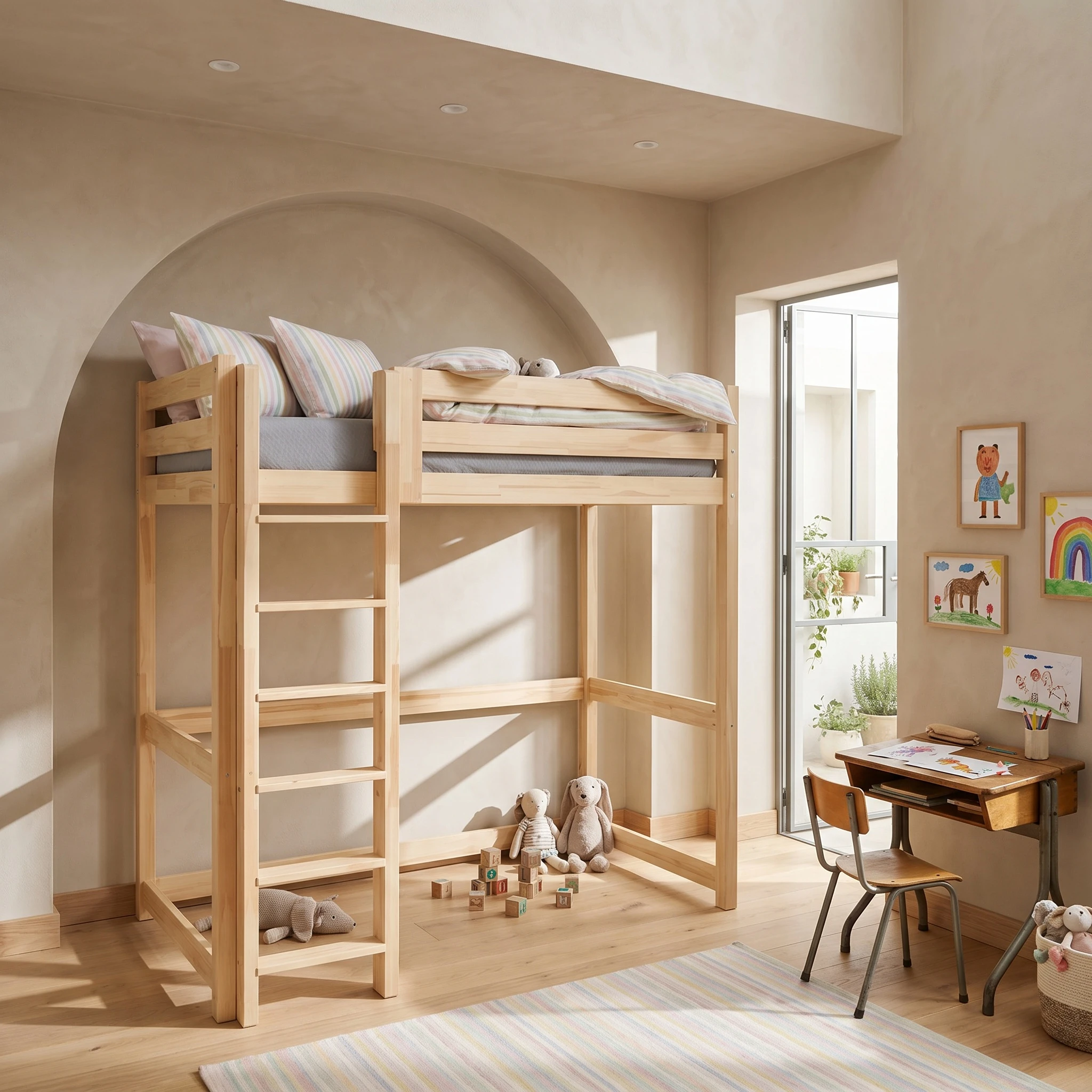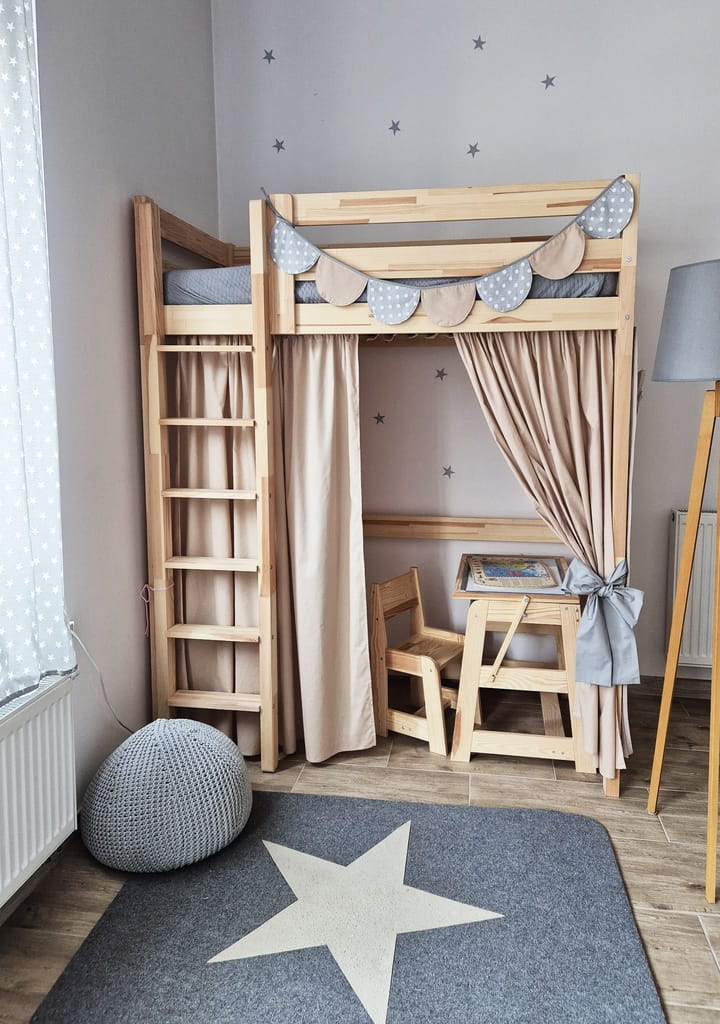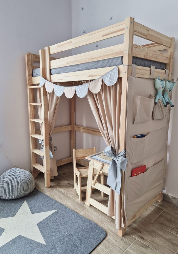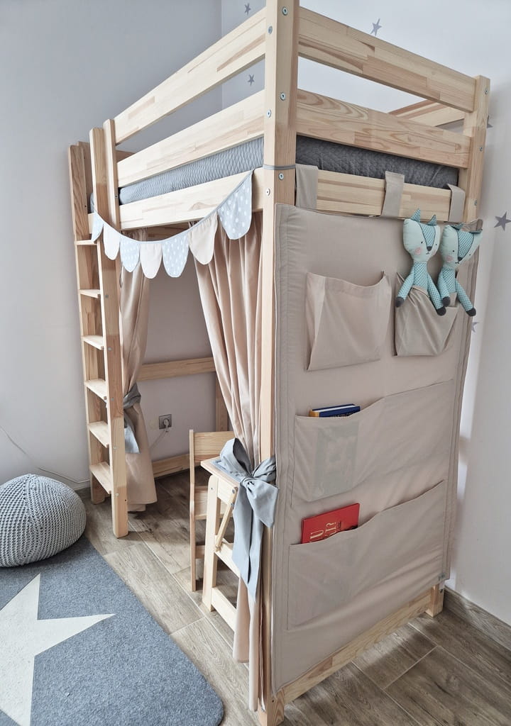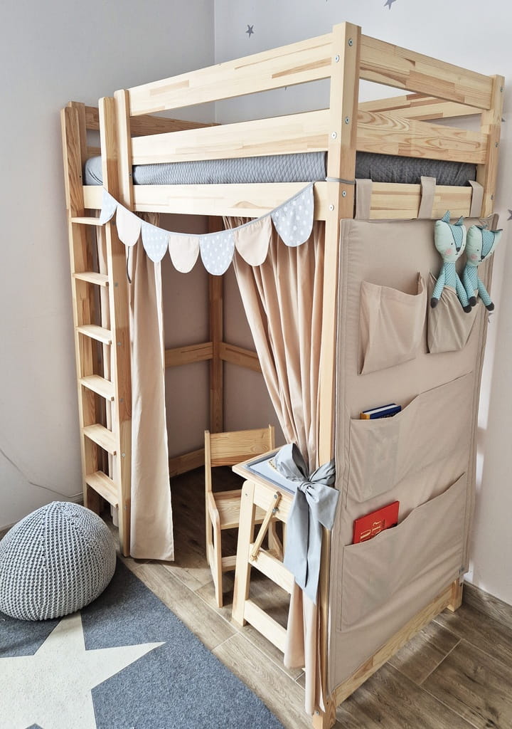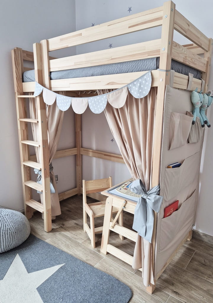 Unsere Betten werden aus geklebter Kiefer Klasse I hergestellt. Verkauft werden sie unbemalt. Für die Kinder ist nämlich natürliches, sehr glattes Holz am sichersten.