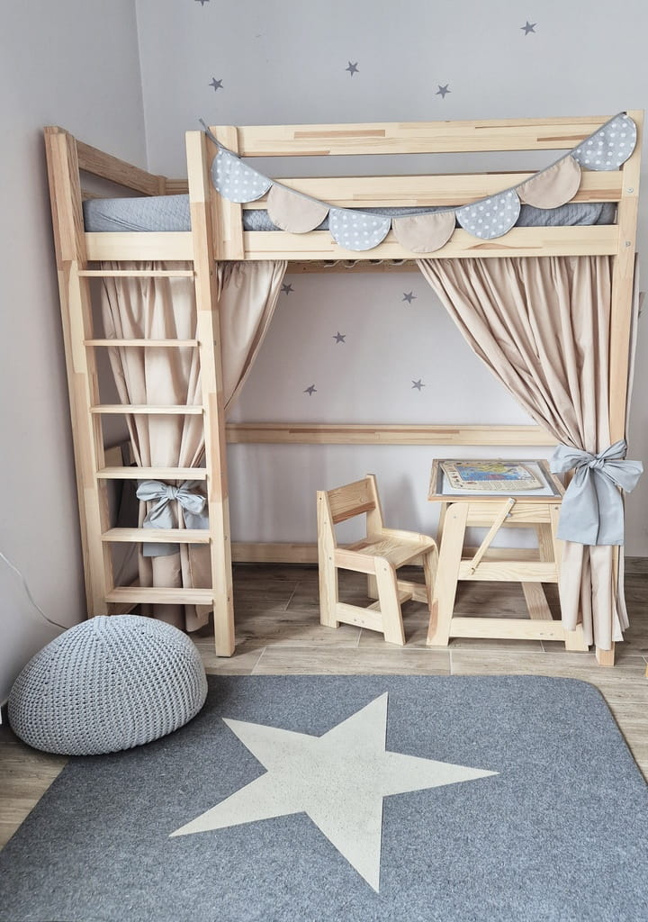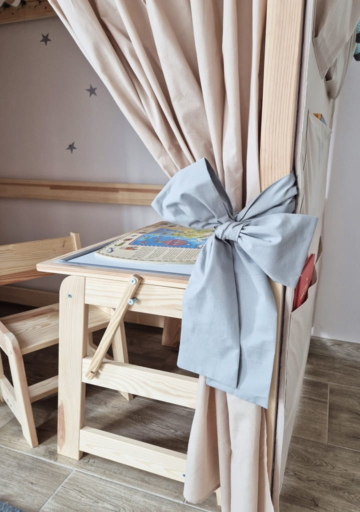 Das Set enthält einen Bettrahmen, eine Barriere, eine Lattenrost, Schrauben und Dübel sowie eine Bedienungsanleitung. Der Preis beinhaltet nicht die Matratze. Selbstmontagebett. Sie können einen Kamin und anderes Textilzubehör für das Kinderbett bestellen.