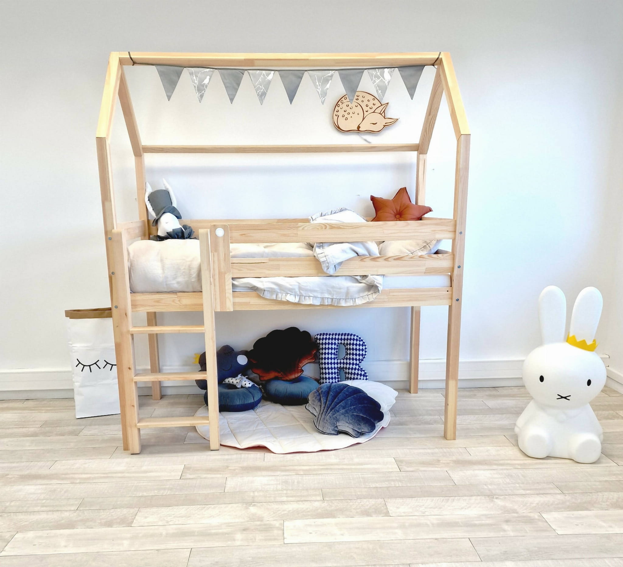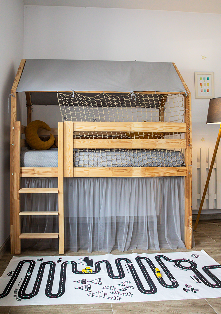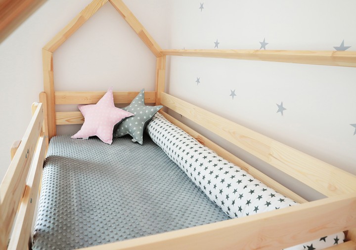 Bett – Holzhaus ist ein perfekter Ort zur Erholung und zum Spielen für jedes Kind. Am Tage dient das Haus zum Spielen, in der Nacht kann man drin gut schlafen.