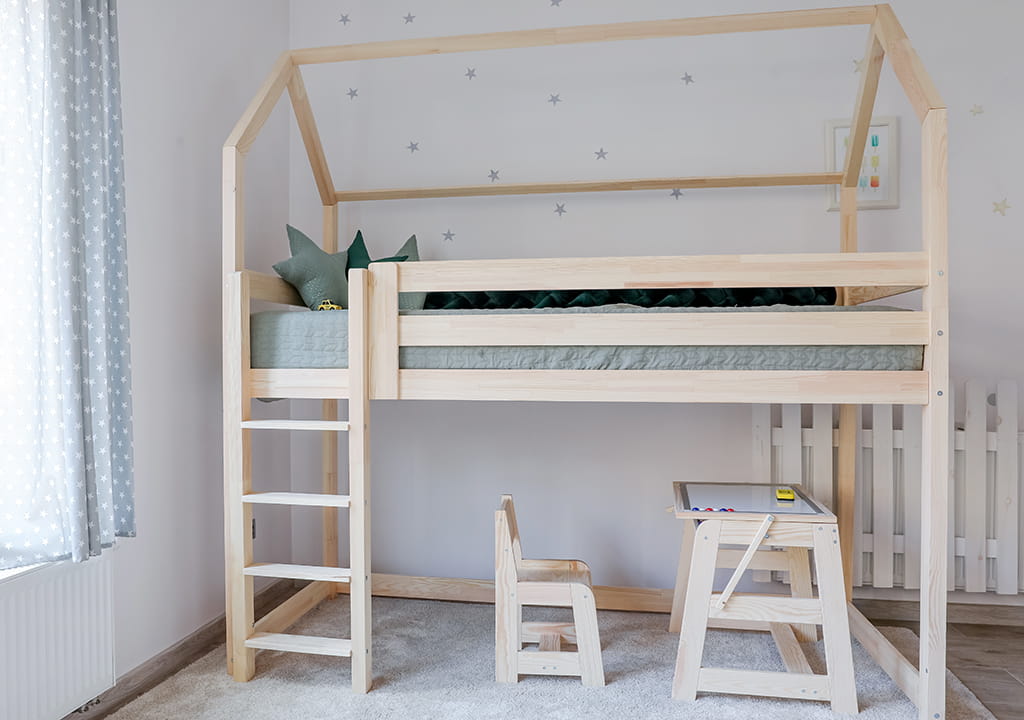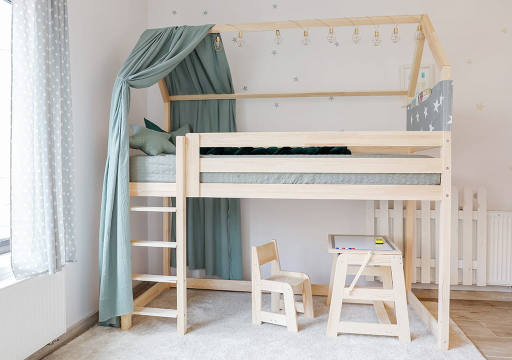 Unsere Betten werden aus geklebter Kiefer Klasse I hergestellt. Verkauft werden sie unbemalt. Für die Kinder ist nämlich natürliches, sehr glattes Holz am sichersten.