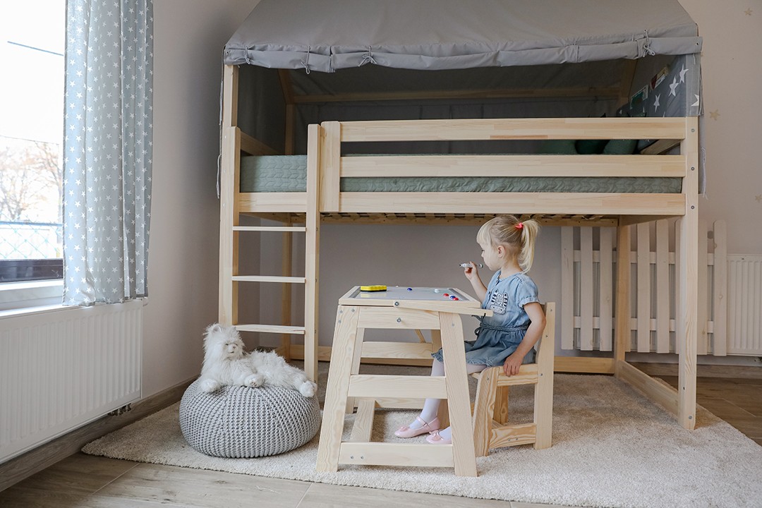 Bett – Holzhaus ist ein perfekter Ort zur Erholung und zum Spielen für jedes Kind. Am Tage dient das Haus zum Spielen, in der Nacht kann man drin gut schlafen.
